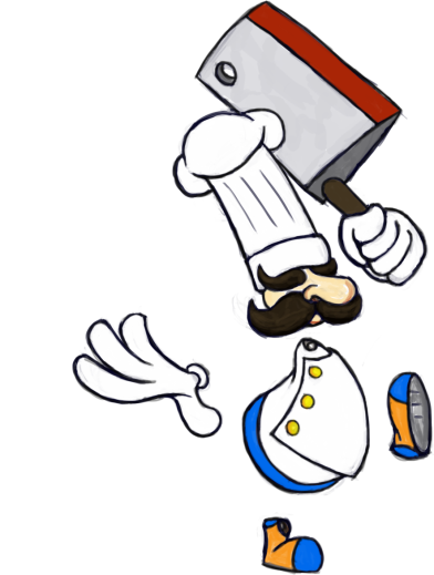 The chef must avoid junk food that has turned evil in this realm while acquiring new ingredients to make for the overlord. When the chef finally acquires all needed ingredients, he must face the overlord to feed them the meal they requested. When the chef enters the overlords’ room, you find out the overlord is in fact a crazed lady who is very hungry. The chef satisfies her hunger which changes the world around him back to the reality he was used to and he returns back home to finally make the hasenpfeffer.
